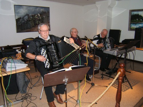 Genom hela festen underhöll Tage Hellmans trio med musik, skrönor och historier samt givetvis ackompanjemang vid allsången när vi avverkade våra vanligaste julvisor under Gösta Gustafssons ledning före hemfärden genom ett höstvarmt Gullänget.
